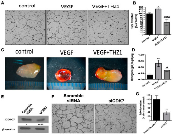 THZ1-induced CDK7 inhibition or CDK7 knockdown suppressed angiogenesis in vitro and in vivo. (A,B) THZ1 reduced VEGF-activated capillary-like tube formation in HUVECs. HUVECs were plated on Matrigel-coated wells and then treated with VEGF (10 ng/mL) in the presence or absence of THZ1 (250 nM). After 16–24 h incubation, HUVEC’s tube formation on Matrigel was photographed (A) and further quantified by counting tube density (B). * p < 0.05 compared to the control group (DMSO); ### p < 0.001 compared to the VEGF (10 ng/mL)-treated group. (C,D) THZ1 diminished VEGF-activated angiogenesis in the in vivo Matrigel plug assay. Matrigel (500 µL) containing VEGF (100 ng) or VEGF (100 ng) plus THZ1 (500 nM) was subcutaneously injected into the ventral area of six-week-old FVB mice (n = 3). After 5 days, Matrigel plugs were excised and photographed (C). Furthermore, hemoglobin content of recovered Matrigel plugs was determined (D). ** p < 0.01 compared to the control group (DMSO); # p < 0.05 compared to the VEGF (10 ng/mL)-treated group. (E–G) siCDK7 decreased CDK7 expression and angiogenic tube forming activity in HUVECs. HUVECs were transfected with scrambled or CDK7-specific siRNAs (siCDK7; cdk-466) for 24 h. The cells were then harvested and subjected to Western blotting analysis for checking CKD7 expression (E). Numbers under the plots indicate the fold change of protein level relative to their control. Further, the transfected cells were seeded onto a Matrigel for verifying and quantifying the activity of tube formation (F,G). ** p < 0.01 compared to the scramble siRNA control group. Similar results were obtained in two independent experiments.