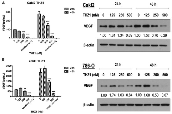 THZ1 dose-dependently inhibited VEGF secretion and expression in Caki-2 and 786-O cells. (A) Caki2 and (B) 786-O cells were treated with various concentrations of THZ1 (125, 250, and 500 nM) for 24 and 48 h. After treatment, the conditioned media were collected for determining VEGF secretion using enzyme-linked immunosorbent assay (ELISA), and the cell lysates were subjected for VEGF expression analysis by Western blotting using antibody against human VEGF. ** p < 0.01 and *** p < 0.001 compared to the control group (DMSO). Numbers under the plots indicate the fold change of protein level relative to their control. Similar results have been obtained in two independent experiments.