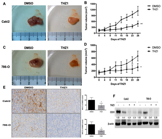 THZ1 inhibited the tumor growth of human C-terminal domain (RCC) cells (Caki-2 and 786-O) with concurrent suppression of angiogenic activity in a xenograft mouse model. Caki-2 and 786-O tumor-bearing mice were intraperitoneally injected with DMSO (n = 7) or THZ1 (n = 8) for 4 weeks. (A,C) Tumors were photographed after harvest. (B,D) Tumor volumes were measured to evaluate the antitumor response to THZ1. Tumor volumes are presented as mean ± standard deviation. * p < 0.05 and ** p < 0.01 compared to the control group (DMSO). (E,F) THZ1 suppressed CD31 expression in the human RCC tumor xenograft. Distribution and expression of CD31 was determined by immunohistochemical staining (E) and Western blot analyses (F). * p < 0.05 compared to the control group (DMSO).