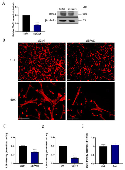 EPAC1 silencing or inhibition decreases leading-edge protrusion (LEP) formation by HASMCs. (A) Detection of EPAC1 by immunoblotting of samples obtained from a representative experiment in which HASMC were treated with siCtrl or siEPAC1 for 48 h is shown. Quantitating levels of EPAC1 in similar samples obtained from n = 3 independent experiments showed that siEPAC1 transfection significantly reduced EPAC1 levels when normalized to tubulin, as assessed using the Student’s unpaired t-test, **** p < 0.0001. (B) Representative images, obtained at either 10× or 40× magnification, of actin-stained LEPs detected on the lower levels (bottom) of FluoroBlokTM transwells (3-μm pores) following a 4 h exposure of HASMCs to an FBS gradient. Prior to exposure of these cells to the FBS gradient, the cells had been transfected either with a control siRNA (siCtrl) or an EPAC1-targeting siRNA (siEPAC) for 48 h. Actin (red) and nuclei (blue) were visualized by incubating fixed cells with TRITC-conjugated phalloidin or DAPI, respectively (scaling bars, 50 µm). Note: Since 3 µm pores precluded migration of HASMCs to the lower level of these transwells, no DAPI (blue) staining is present in these images. (C) Quantification of the LEPs formed by siCtrl or siEPAC1 transfected HASMCs following their exposure to the FBS gradient are shown. Statistically significant reduction in LEPs formed by siEPAC1 HASMCs compared to siCtrl HASMC was determined by comparing results obtained in n = 3 independent experiments using the Student’s unpaired t-test, **** p < 0.0001). (D–E) Quantification of the impact of inhibiting EPAC1 with CE3F4 (20 µM) (D) or activating EPAC1 with 8-CPT-2′-O-Me-cAMP (100µM) (E) on LEP formation in HASMCs in n = 3 independent experiments using the Student’s unpaired t-test, **** p < 0.0001.