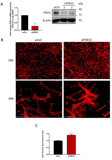 While previous studies have shown that pharmacological inhibition of the dominant HASMC cAMP PDEs, namely PDE1, PDE3, or PDE4, like PKA activation, reduced their migratory capacity [1,21], we hypothesized that selective pharmacological inhibition of PDE1, PDE3, or PDE4 might differentially impact the ability of these cells to form LEPs. Interestingly, while selective inhibition of HASMC PDE3 activity with cilostamide (5 µM) [1,22] reduced LEP formation in HASMCs, PDE4 inhibition with Ro 20-1724 (10 µM) did not (Table 3). Unexpectedly, pharmacological inhibition of PDE1 activity (C33, 1 µM) [23,24] in these cells markedly promoted the formation of LEPs in our experiments (Table 3). Although HASMCs have been reported by us and others to express both PDE1A and PDE1C gene-encoded enzymes, since PDE1C preferentially hydrolyzes cAMP compared to PDE1A, we next investigated the possibility that PDE1 inhibitors acted by inhibiting cAMP hydrolysis by PDE1C. Consistent with this hypothesis, silencing PDE1C (Figure 2A) increased the formation of LEPs (Figure 2B,C) and obviating the LEP producing effects of the PDE1 inhibitor, C33 (Table 4).