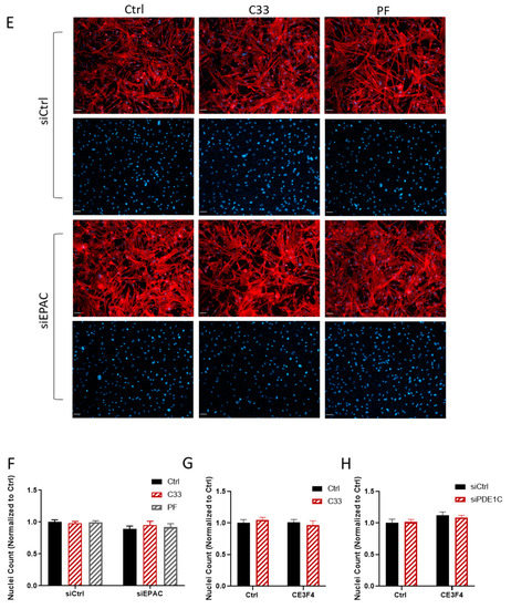 Since inhibition or silencing of the cAMP effector EPAC1 reduced LEP formation and PDE1 inhibition, or PDE1C silencing promoted the formation of these structures, we next investigated whether EPAC1 promoted LEP formation through a PDE1C-sensitive mechanism. To investigate this idea, we determined whether silencing EPAC1 would antagonize PDE1 inhibitor-mediated formation of LEPs in these cells. Thus, while PDE1 inhibition with either C33 (1 µM) or with PF-04827736 (1 µM) [25] promoted LEP formation in control HASMCs, neither of these PDE1 inhibitors were able to rescue LEP formation in EPAC1-silenced cells (Figure 3A,B) or in cells in which EPAC1 was inhibited (Figure 3C). Also, while silencing PDE1C promoted LEP formation in control cells, this basal effect and the ability of EPAC1 inhibition to promote LEP formation were lost in PDE1C-silenced HASMCs (Figure 3D). To obviate that our results reflected an effect related to a reduced adhesion of HASMCs to the upper surface of the transwells upon PDE1 inhibition or EPAC1-silencing, or loss of cells during the treatments periods, we counted HASMC nuclei which were present on the upper surfaces of the transwells, in which we detected changes in LEP numbers. As shown in (Figure 3E–H), inhibition or silencing of either PDE1C or EPAC1 did not significantly impact the number of HASMCs on the upper surface of the FluoroBlokTM transwell in our studies.