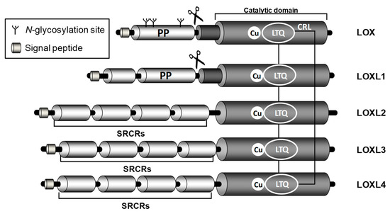 - Trackman, P.C. Functional importance of lysyl oxidase family propeptide regions. J. Cell Commun. Signal. 2018, 12, 45–53. [Google Scholar] [CrossRef] [PubMed]