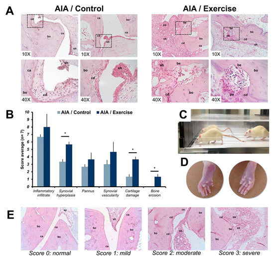 Effects of exercise on tarsal bone histological parameters in adjuvant-induced arthritis rats. (A) Representative images of histological findings in the tarsal joints of the study groups at the end of the exercise intervention using H&E staining. (B) Joint involvement was scored by the semi-quantitative scale (showed in E) to describe inflammatory changes and structural remodeling in the tarsal joints (7 rats per group). The t-student test was used to compare histological measurements between groups. * p < 0.01. (C) Exercised rats on a treadmill. (D) Representative images of clinical changes on hind paws of adjuvant-induced arthritis (AIA) rats exercised (left) and non-exercised (right). (E) Representative images of the inflammation and structural joint damage scores in the tarsal joints of AIA rats. The 0 (normal) score was established in healthy rats, where the bone (bo), cartilage (ca) and synovium (sy) did not show alterations. The arthritis scores 1 (mild), 2 (moderate), and 3 (severe) were based on the inflammatory changes: the presence of synovial hyperplasia (sh) and pannus (pa) and structural remodeling: cartilage damage (cd) and bone erosion (be). The images were acquired with a 10× and 40× amplification. AIA: adjuvant-induced arthritis.
