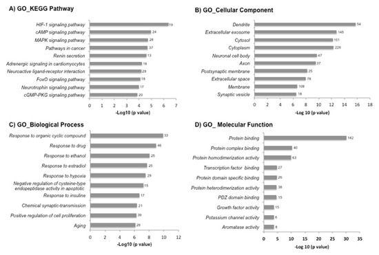 The Gene Ontology (GO) and Kyoto Encyclopedia of Genes and Genomes (KEGG) pathway enrichment analysis of differentially expressed genes in the DAVID database. The 719 differentially expressed genes by exercise were uploaded into the DAVID database for enrichment analysis. The top 10 GO analysis results of these dysregulated genes were displayed in the bar chart: (A) KEGG pathway, (B) cellular component, (C) biological process and (D) molecular function. The bars indicated the -Log10 (p value) of each GO and KEGG term. The number of genes involved in each term is shown on the right side of each bar.
