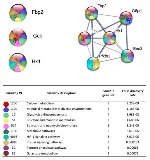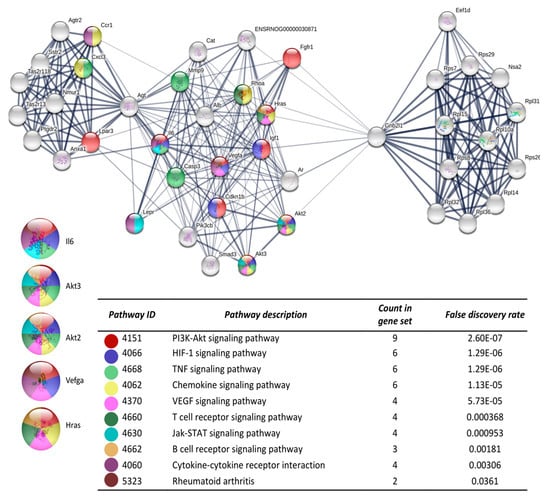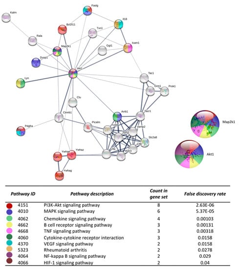 After the analysis on DAVID, the list of the 719 DEGs was analyzed on the STRING and Cytoscape-MCODE platforms. The first three clusters obtained are shown in Figure 3, Figure 4 and Figure 5. The genes from the first three clusters were loaded in STRING to identify the associated KEGG signaling pathways; those relevant in RA were selected and marked with different colors. The pathways considered as relevant included the HIF-1 signaling pathway. The analysis of the protein networks unveiled relevant genes dysregulated by PE. Those presented multiple functional connections included up-regulated genes such as serine-threonine protein kinases Akt1, Akt2, and Akt3; the vascular endothelial growth factor A (Vefga), the mitogen-activated protein kinase kinase 1 (Mapk1), phosphatidylinositol 4,5-bisphosphate 3-kinase catalytic subunit beta isoform (Pik3cb), glucokinase (Gck), fructose-biphosphatase2 (Fbp2); and also down-regulated genes such as interleukin 6 (Il6).