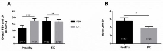 Expression of LH and FSH, and the LH/FSH ratio in healthy (n = 47) and KC (n = 86) blood (plasma) samples. (A) Overall levels for both LH and FSH, and (B) LH/FSH ratio in healthy controls and KCs. * p < 0.05, ** p < 0.01, *** p < 0.001. (See Supplementary Materials—Figure S1).