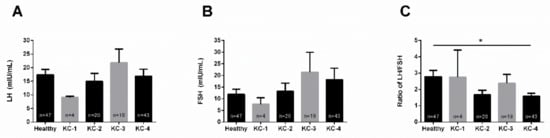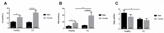 Regarding the LH/FSH ratio, KCs showed a lower ratio in both males and females (Figure 2C), when compared to their healthy counterparts. Specifically, the LH/FSH ratio in KC females tended to be lower than in healthy females, but not significantly (Figure 2C). However, the LH/FSH ratio in KC males was significantly lower compared to healthy males (Figure 2C).