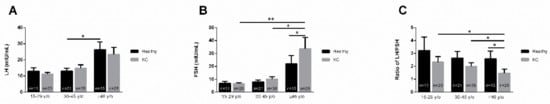 Age-dependent expression of LH and FSH, and the LH/FSH ratio, in healthy and KC blood (plasma) samples. Three age groups were investigated: Healthy 15–29 y/o (n = 11), KC 15–29 y/o (n = 20), Healthy 30–45 y/o (n = 21), KC 30–45 y/o (n = 38), Healthy ≥ 46 y/o (n = 15) and KC ≥ 46 y/o (n = 28). (A) LH levels in healthy controls and KCs, per age group, (B) FSH levels in healthy controls and KCs, per age group, and (C) the LH/FSH ratio in healthy controls and KCs, per age group. * p < 0.05, ** p < 0.01. (See Supplementary Materials—Figure S3).
