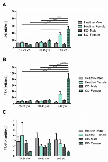 The LH/FSH ratio analysis showed no significant changes. However, it is interesting to highlight that the lowest LH/FSH ratio was seen in KC females at the 15–29 y/o and ≥46 y/o age groups.