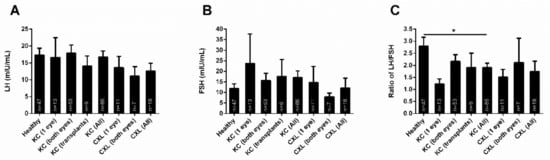 Expression of LH and FSH, and the LH/FSH ratio in healthy (n = 47) and KC (n = 86) blood (plasma) samples. Seven different groups were compared: (1) KC on one eye (n = 13), (2) KC on both eyes (n = 53), (3) KCs with corneal transplants (n = 9), (4) All KCs independent of treatment(s) (n = 86), (5) KCs with collagen crosslinking on one eye (n = 11), and (6) KCs with collagen crosslinking on both eyes (n = 7), and 7) All KCs with collagen crosslinking treatment, independent of the number of eyes (n = 18). (A) LH levels, (B) FSH levels, and (C) the LH/FSH ratio. * p < 0.05. (See Supplementary Materials—Figure S6).