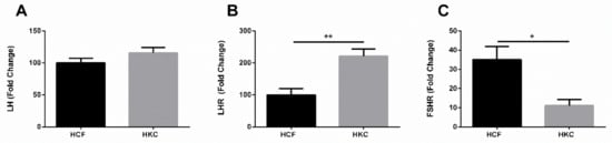 Expression of LH, LHR, and FSHR in HCFs and HKCs. (A) LH expression in vitro, (B) LHR expression in vitro, and (C) FSHR expression in vitro. * p < 0.05, ** p < 0.01. (See Supplementary Materials—Figure S7).
