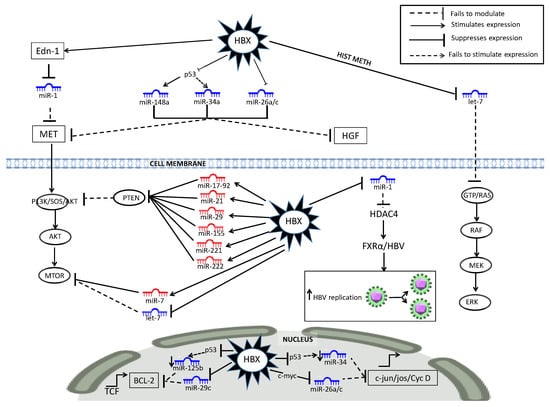 Understanding of the molecular etiology of HCC remains incomplete [244]. Evidence to date shows that HCC generally involves a range of disruptions of the PI3K/MAPK pathways and the p53 network that includes cell cycle controls (RB1), as well as increased WNT signaling and the inactivation of key tumor suppressors (SOCSI) in the JAK/STAT network [18,19]. Alterations of RB1, p53, and WNT pathways in HCC are frequently associated with HCV, HBV, and alcoholic liver cirrhosis [245]. This section focuses on examples of HBx-induced dysregulation of miRNA in HBV-HCC pathways.