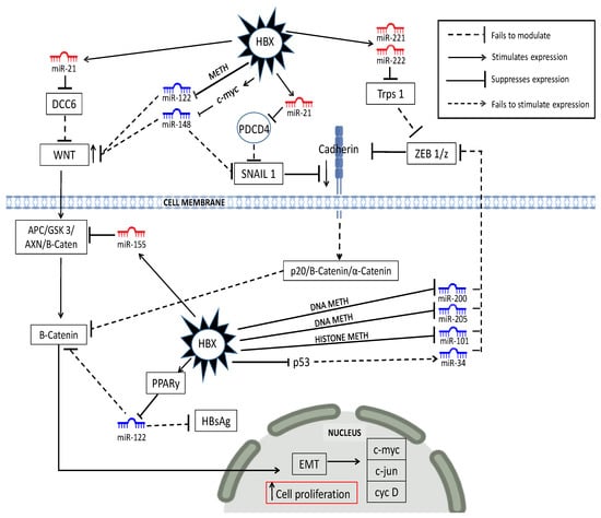 The upregulation of the WNT/β-catenin pathway is a frequent event in early HCC [251]. It yields an aggressive phenotype that is implicated in the proliferation, migration, invasion, and survival of cancer cells [244]. Figure 2 illustrates some examples of HBx-dysregulated miRNAs and their target genes in this pathway. The HBx protein typically plays a role in enhancing WNT and β-catenin expression while suppressing the expression of E-Cadherin. WNT signaling, for instance, is not modulated as a result of HBx led downregulation of miR-122/148a/b [157,173,174] and Cadherin expression is suppressed because these miRNA fail to suppress cadherin suppressors like SNAIL 1 [174]. HBx-induced upregulation of mIR-21 also enhances WNT signaling because it reduces DCC6 suppression of WNT signaling [252] and contributes to the suppression of E-cadherin by suppressing PDCD4 expression [55]. HBx-upregulated miR-221/-222 also contributes to the suppression of cadherin by enhancing ZEB 1/2 via blocking one of its suppressors like TRPS-1 [54,157]. Cadherin expression is also suppressed as a result of HBx-induced downregulation of miR-200/-205/-101/34 that fails to regulate ZEB 1/2 [95,150,190]. HBx-induced downregulation of miR-122 reduces β-catenin-led transcription in the cytoplasm [156], while HBx upregulation of miR-155 blocks the APC tumor suppressor in the WNT pathway, as well as suppresses HBV replication by blocking enhancer 11 to potentially hide the virus from the host immune system [28,31].