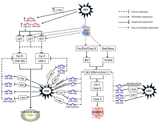 The deregulation of multiple p53 pathways is a central event in the progression of HBV-HCC [253]. The INK4alpha/ARF locus, that encodes p14(ARF) and p16(INK4alpha) to arrest the cell cycle in the p53 and RB pathways, is frequently disrupted in HCC [254]. Figure 3 illustrates how HBx directly targets p53 expression [28,241] to influence the expression of miRNAs in this pathway. Typically, the HBx protein downregulates miR-26a/-34a/-138/15a/16-1, that fail to modulate cyclinD/CDK 4/6 and cyclinE/CDK2 expression [78,168,197,207], as well as miR-122/-Let-7/-34a/-125b/15a/16-1 [78,145,255,256,257,258], that then fail to modulate BCL-2-mediated suppression of CASP9/3-induced apoptosis. Similarly, HBx downregulation of miR-101/-125b/-29a/-Let-7 exerts an anti-apoptotic effect by failing to modulate MCL-1-mediated suppression of CASP9/3-induced apoptosis [200,255,258,259]. HBx-induced C-MYC upregulation of miR-17-92 and miR-221/222 also contribute to the E2F-mediated downregulation of p21/p27/p57 expression as a regulator of cyclins and cyclin-dependent kinases (CDKs) in the network [82,223,230].
