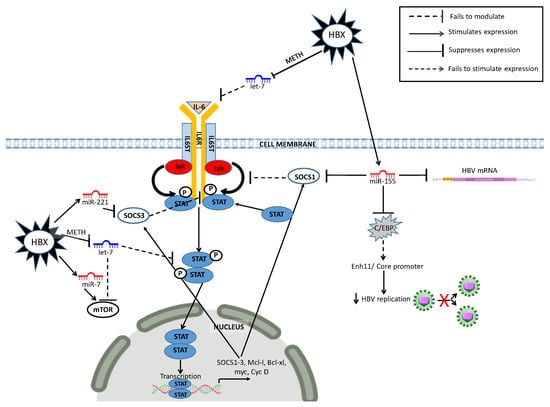 The aberrant methylation in the CpG island of the SOCS-1 gene is a common feature in HBV-HCC and its silencing demonstrates its important tumor suppressor role in the JAK/STAT pathway [260]. Suppressor of cytokine signaling (SOCS-1) switches this signaling ‘off’ by means of its direct interaction with (JAK). The loss of function of SOCS-1 is a common feature in HCC and the HBx-mediated upregulation of miR-155 is a contributing factor in HBV-HCC (see Figure 4) [261,262]. HBx upregulated miR-221/-203 contribute to a reduction in SOCS3 regulation of JAK/STAT signaling [263]. HBx also downregulates Let-7, which reduces its modulation of IL-6 induced activation of JAK/STAT signaling and mTOR mediated transcription of oncogenic proteins like C-MYC/MCL-1 [145,250,264]. However, HBx upregulation of miR-7 [241], has been demonstrated as a control by way of suppressing mTOR signaling in JAK/STAT pathway [250].
