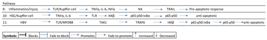 In this stage, chronic inflammation, accompanied by T-cell response, causes tissue damage where the continuous replacement of hepatocytes is initially achieved by differentiated hepatocytes, which eventually become depleted and are replaced by the recruitment of non-epithelial cells in the liver [18]. While their activation and proliferation initially serves to support the immune response and the regeneration of the tissue, during chronic liver damage and with increasing inflammation, their expansion predominates and they gradually replace epithelial structures in the organ. Inflammation/injury induces pro-inflammatory cytokines like tumor-necrosis factor-alpha (TNFα) and interleukin 6 (IL-6) by activating Kupffer cells and liver-derived macrophages. The activation of pro-inflammatory cytokines like TNFα and Il-6 can induce both pro-apoptotic and anti-apoptotic effects in injured liver tissue [41,42]. A pro-apoptotic response would, typically, be triggered by inflammation/necrosis that triggers Toll-like receptor (TLR) signaling to induce Kupffer cells to synthesize pro-inflammatory cytokines like TNFα, IL-6, and interferon alpha (IFNα), that recruit natural killer cells (NKs) to promote TNF-related apoptosis-inducing ligand (TRAIL) [43,44,45] (see Scheme 2, pathway 9).