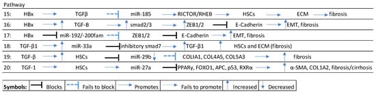 A hypothesized HBx-directed fibrogenic miRNA pathway involves miR-185 as follows: HBx promotes TGFβ signaling, that blocks miR-185 that, in turn, fails to modulate Rapamycin-insensitive companion of mammalian target of rapamycin (RICTOR/RHEB), resulting in the activation of HSCs, ECM proteins, and the development of fibrotic tissue [111,112] (see Scheme 4, pathway 15).