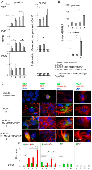 Relapsing-remitting multiple sclerosis (RR-MS) CD49d+CD154+ lymphocytes affect maturing oligodendrocyte precursor cells (OPCs), resulting in dysregulation of myelin production by mature oligodendrocytes (OLs). (A) RR-MS CD49d+CD154+, contrary to healthy control (HC) lymphocytes, affected myelin basic protein (MBP) and proteolipid protein (PLP) but not myelin oligodendrocyte glycoprotein (MOG) synthesis by human OPCs (hOPCs). (B) MBP/PLP index more clearly exhibited disproportion in myelin protein synthesis. (C) Immunocytochemical (ICC) analysis of nestin, O4 and GFAP expression in hOPCs demonstrated that RR-MS CD49d+CD154+ lymphocytes did not affect hOPC maturation, but caused dysregulation of MBP and PLP synthesis by mature OLs. All data are presented as means ± SD.