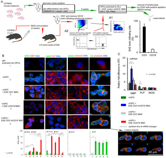 To confirm whether our in vitro observations are reflected at the site of remyelinating plaques in vivo, we used the mouse model of MS (EAE). As RR-MS CD49d+CD154+ lymphocytes induced in the periphery consisted of both T and B cells, we hypothesized that these subpopulations can cooperate in deregulation of myelin synthesis by OLs [10]. Therefore, lymphocytes isolated from EAE brains were sorted into T (CD3+) and memory B (mCD19+) cells and then cocultured with OPCs isolated from healthy newborn mice (mOPC), as seen in Figure 2A. Upon isolation of lymphocytes, they were mixed at a ratio of 10:1 (CD3+/mCD19+) to reflect the results of chemotaxis experiment of human RR-MS CD49d+CD154+ lymphocytes [10]. Due to the limited cell number, we used the ICC technique to confirm the role of EAE CD3+/mCD19+ BMC-derived cells in dysregulation of myelin synthesis by mOLs. Both ICC and quantitative mRNA analysis demonstrated high MBP and low PLP expression, while MOG levels were not affected during the coculture of mOPCs with CD3+/mCD19+ BMC-derived cells, as seen in Figure 2B,C. Although T cells alone were able to dysregulate myelin synthesis in OLs, the most visible differences were noted in the cocultures where both CD3+ and mCD19+ were present. CD3+/mCD19+ BMC-derived cells did not affect the morphology of maturing OPCs or their viability/apoptosis. DIC microscopy, as seen in Figure S1B, low panel, and ICC analysis revealed no changes in phalloidin/O4 (OLs mature marker), phalloidin/GFAP (astrocyte marker), or nestin expression (OPC marker) in mOPCs incubated with EAE CD3+ or mCD19+ cells, in comparison to mOPCs incubated alone, as seen in Figure 2B. To confirm that dysregulated protein synthesis was not a result of OL lysis, LDH assay and ANX-V/PI labelling were performed. Similar to human cells, CD3+/mCD19+ BMC-derived cells did not induce lysis or apoptosis of mouse maturing OPCs, as seen in Figure S1B, right panel.