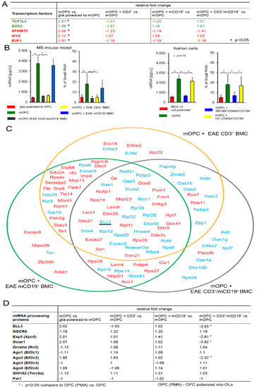 EAE BMC-derived cells as well as RR-MS CD49d+CD154+ lymphocytes affect miRNA synthesis, but have no direct effect on the transcriptional factors. (A) EAE BMC-derived cells did not change mRNA expression of transcription factors responsible for adult OPC activation (green font) as well as differentiation and myelin sheaths formation (red font). (B) RR-MS CD49d+CD154+ lymphocytes as well as CD3+/mCD19+ and CD3+ EAE BMC-derived cells affected intracellular miRNA concentrations during OPC maturation. Data are presented as means ± SD. (C) Bioinformatic analysis of genes responsible for mRNA binding and miRNA processing point to the polymerase II elongation factor (ELL3). From the total of 33,000 genes, those mostly affected during physiological OPC maturation and associated with mRNA binding or engagement in miRNA synthesis were selected. 43 genes from this group, with statistically significant fluctuations in the presence of CD3+/mCD19+ EAE BMC-derived cells were selected. Twenty-three were upregulated (red font) and 20 downregulated (blue font). The most significant alterations were observed in ELL3 expression. (D) The validation of ELL3 and the other miRNA processing proteins by qPCR points to Exp5, DICER1, and Ago2, which were reduced in maturating OPCs in the presence of CD3+/mCD19+ EAE BMC-derived cells.