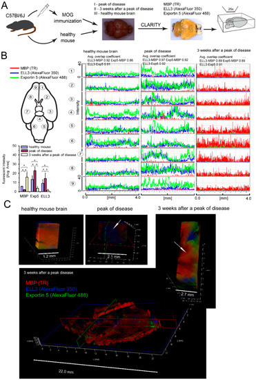 Several studies have emphasized that miRNA molecules which act on posttranscriptional level play an important role in controlling lineage-specific development and functioning of various cell types [21]. RR-MS, contrary to HC CD49d+CD154+ lymphocytes, decreased intracellular miRNA concentrations in hOPCs and diminished relative proportions of miRNA to small RNA, as seen in Figure 3B, right panel. We demonstrated similar results in mOPCs and EAE BMC-derived T cells and memory B cells. Specifically, CD3+ and mCD19+ cells at a ratio of 10:1 had greater effect on miRNA concentrations than CD3+ cells alone. mCD19+ cells alone did not affect the level or proportion of miRNA/small RNA in mature OLs, as seen in Figure 3B, left panel. Significant reduction of miRNAs in OPCs after exposure to proinflammatory cells can be a result of their synthesis in the nucleus and/or mechanisms regulating their cytoplasmic presence. miRNA biogenesis is a multistep process initiated by RNA polymerase II [22]. Using a microarray technique, we analyzed the expression of all known factors associated with the synthesis of miRNA and its intracellular activity in mOPCs. A bioinformatic analysis of mOPCs cultured with EAE brain-infiltrating CD3+, mCD19+, or CD3+/mCD19+ cells indicated 43 genes characterized by the highest fluctuations. Twenty genes were downregulated and twenty-three were upregulated in mOPCs in the coculture with EAE brain-infiltrating CD3+/mCD19+ cells. However, statistically significant differences were observed only in ELL3 (an RNA polymerase II elongation factor), exportin 5 (Exp5), DICER1, and Ago2, which were downregulated in comparison to mOPCs cultured alone, as seen in Figure 3C,D. We did not notice any changes in the expression of other proteins directly involved in miRNA processing, DGCR8, DROSHA, GW182, Ago1, 3, 4, and FXR1, as seen in Figure 3D. Validation of ELL3 and Exp5, the two main factors responsible for synthesis and transporting immature miRNA from nucleus to cytoplasm at the protein level, was done with the quantitative protein analysis as a whole brain imaging by CLARITY. Using healthy and EAE mouse brains collected at the peak of disease (3.5–4 score) and three weeks after the acute phase (1–1.5 score), we performed an analysis of ELL3, Exp5, and MBP expression in the gray matter and demyelinating plaques, as seen in Figure 4A. During the acute phase, we noted that at the sites characterized by low MBP level (demyelinating plaques), ELL3 and Exp5 expressions were significantly higher than three weeks after the peak of the disease, as seen in Figure 4B. During the remyelinating phase (three weeks after the peak of disease), we observed inversed expression of these proteins: MBP fluorescent signal was high, whereas ELL3 and Exp5 reduced. Additionally, high overlap coefficient (r2 > 0.89 for ELL3-MBP and EXP5-MBP, p < 0.05) pointed to a strong correlation between low ELL3/Exp5 expression and high MBP synthesis during remyelination and on the contrary, high ELL3/Exp5 and low MBP expression at the peak of disease (r2 > 0.97 for ELL3-MBP, 0.92 EXP5-MBP, respectively, p < 0.05), as seen in Figure 4B, upper-right panel.