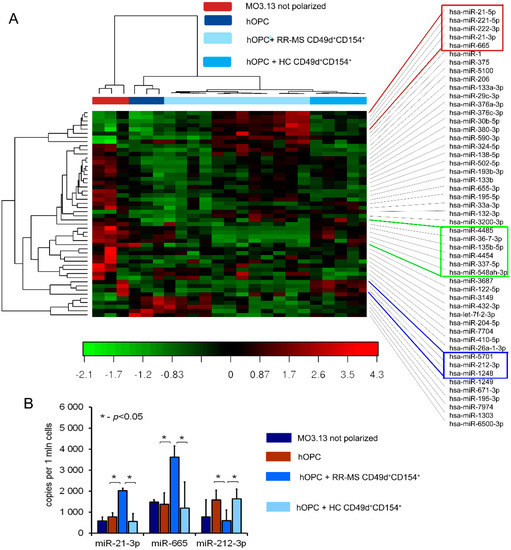 RR-MS myelin-specific CD49d+CD154+ lymphocytes interfere with miRNA profiling in maturing OPCs. (A). Heat map revealed a specific miRNA profile for every cell culture experimental settings. Based on the differences between the effect of RR-MS and HC CD49d+CD154+ lymphocytes on OPCs, three clusters were selected (red, green, and blue frames). The most significant differences were observed in the cluster with hsa-miR-21-5p, hsa-miR-221-5p, hsa-miR-222-3p, hsa-miR-21-3p hsa-miR-665 (red frame), and hsa-miR-212-3p (blue frame). The data was normalized with the trimmed mean of M-values method and converted to a log2 scale. Red represents an expression level above the mean, while green one level below. (B) Validation of selected miRNA by copy transcript estimation using ddPCR analysis in additional cohort patients. Data are presented as means ± SD.