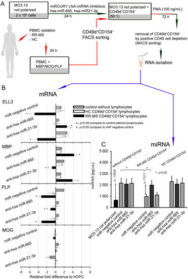 A total of 6 × 105 MO3.13 cells were seeded on six-well culture plates (37 °C, 5% CO2) one day before transfection to achieve suitable confluence. For transfection, X-treme GENE 9 Reagent (Roche) was used. Cells were transfected with 50 nM miRCURY LNA inhibitors: hsa-miR-21-3p, hsa-miR-665, hsa-miR-21-3p with hsa-miR-665, and Negative Control A which does not recognize any human gene (Exiqon, Vedbæk, Denmark). After 48 h incubation (37 °C, 5% CO2), RR-MS myelin-specific CD49d+CD154+ lymphocytes or HC lymphocytes were added to transfected MO3.13 cells stimulated with PMA (100 nM). After 72 h incubation (37 °C, 5% CO2), cells were separated using CD45 MicroBeads (Miltenyi Biotec, Bergisch Gladbach, Germany).