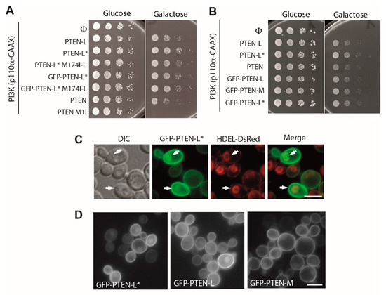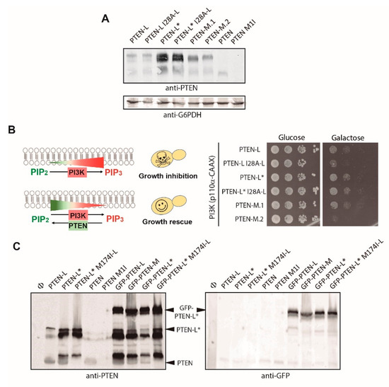 Next, we systematically tested the ability of PTEN variants to counteract PI3K-induced growth inhibition in yeast, as read-out of their catalytic activity in vivo. As shown in Figure 3A,B, all PTEN variants tested rescued growth in the presence of the p110α PI3K catalytic subunit, demonstrating their functionality, with the exception of PTEN M1I, lacking the start ATG codon of the canonical short PTEN cDNA (Figure 3B), which was not expressed (see negative controls in Figure 2A,C). Unlike PTEN M1I, both PTEN-L* M174I-L and GFP-PTEN-L* M174I-L, in which expression of canonical short PTEN is abrogated, rescued PI3K-toxicity to the same extent as the respective wild type versions, and even more efficiently than canonical PTEN. This result confirms full catalytic competence for N-terminal extended PTEN versions and is consistent with previous work showing the effect of PTEN isoforms on Akt activation in higher cells [30,31,34,38].