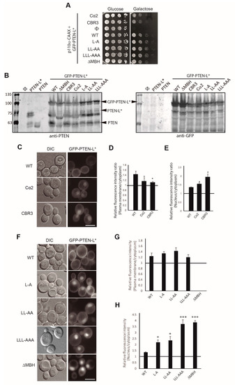 Interestingly, although GFP signal at the PM for the single or multiple Leu to Ala mutants was comparable to that of WT GFP-PTEN-L*, it was totally absent for PTEN-L*-∆MBH. However, all these mutants, especially PTEN-L*/LLL-AAA and PTEN-L*-∆MBH showed a relocation to the yeast nucleus (Figure 4F–H). We counted at the fluorescence microscope the percentage of cells with apparent nuclear accumulation of GFP-PTEN-L*. For WT GFP-PTEN-L*, while all cells displayed the characteristic PM pattern, only 71% of these cells additionally showed detectable nuclear signal. In contrast, we found that 100% of cells from cultures expressing any of the MBH mutant proteins exhibited nuclear GFP signal, and the nucleus/cytoplasm RFI ratio of GFP-PTEN-L*almost doubled (in the L-A mutant) or tripled (in the LLL/AAA or ∆MBH mutants) that of the WT (Figure 4H). Our results imply that the MBH is indeed essential for robust PM localization of PTEN-L, as proposed by Masson et al. [35] and, furthermore, that it strongly prevents PTEN-L import into the nucleus. It is particularly intriguing that the GFP-PTEN-L* version deleted for the MBH, which does not express the short version of PTEN and is severely concentrated in the nucleus, is still functional, as judged for its ability to counteract PI3K toxicity in yeast (see Figure 4A). Thus, in spite of its effect on PM tethering, this putative helix does not seem to significantly contribute to PTEN-L activity on PIP3 dephosphorylation in vivo.