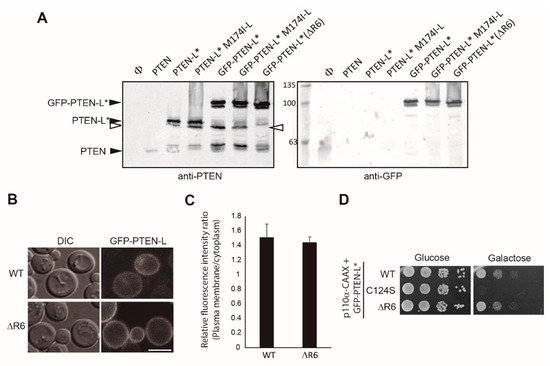 Expression in yeast of a GFP-PTEN-L* deleted in its poly-Arg stretch. A. Immunoblots on lysates obtained from yeast transformants expressing the indicated versions of PTEN or GFP-PTEN-L*, as indicated. The same membrane was hybridized with anti-PTEN (left) and anti-GFP antibodies. The white arrowheads point a band, likely a degradation product, that is present in all PTEN-L* forms except the ΔR6 mutant. B. Bright field (DIC) and fluorescence microscopy of YPH499 strain transformants expressing WT GFP-PTEN-L* or the ΔR6 mutant. Scale bar corresponds to 5 µm. C. Average plasma membrane: cytoplasm RFI ratios of transformants as in B. Error bars graphs correspond to the standard deviation. D. Drop growth assays on agar on co-transformants bearing the indicated versions of GFP-PTEN-L* and p110α-CAAX.
