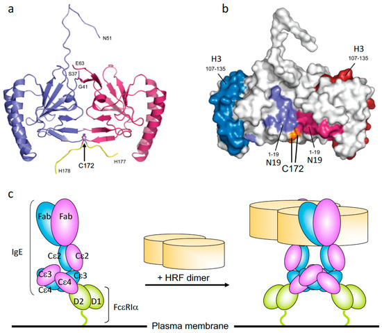 HRF is constitutively secreted as a monomer, a disulfide-linked dimer, and higher molecular weight oligomers. Crystal structures of HRF monomers from various species and a homodimer of human HRF have been solved. The homodimer is made by a disulfide bond through a Cys172-Cys172 linkage between two monomers [28,29]. Kim et al. showed that N-terminally truncated recombinant rat HRF proteins, Del-N11TCTP and Del-N35TCTP, but not full-length TCTP, also form disulfide-linked dimers with strong cytokine-like activity [29]. However, Doré et al. observed dimers of full-length mouse and human HRFs [28]. Consistent with the efficacy of HRF inhibitors in allergic disease models (see below), IgE-binding sequences (i.e., N19 and H3) are exposed on the molecular surface of HRF dimer (Figure 1a,b) [28]. Recombinant HRF homodimers, but not monomers, synthesized in E. coli can activate murine mast cells [30]. GST-HRF fusion proteins induce not only histamine release [8] but also secretion of IL-4 and IL-13 from human basophils [15,16]. It is well known that GST fusion proteins can form dimers. Thus, these results suggest that FcεRI-bound IgE molecules are cross-linked by HRF dimers (Figure 1c). HRF homodimers are also able to enhance IgE and antigen-stimulated production of IL-6, IL-13, and TNF but not β-hexosaminidase release (which is fully activated by stimulation with antigen) from murine mast cells. This result suggests that cytokine production requires stronger and/or more persistent FcεRI cross-linking than does degranulation. These observations can be extended to the argument that HRF exerts its effects by activating FcεRI signaling pathways. However, subtle differences in signaling may occur, as components of the ligand complex are different when cells are stimulated with antigen/IgE complexes bound to FcεRI with or without HRF. Intranasal instillation of recombinant HRF (including HRF dimers), but not HRF-2CA (a monomeric mutant of HRF with the two cysteine residues being replaced with alanine), reduced/carboxymethylated or boiled HRF, in naïve mice triggered airway inflammation in an FcεRI-dependent manner [24]. The wide gamut of signs seen in allergic diseases ranging from the mild skin rashes and gastrointestinal symptoms, to more severe signs such as pulmonary distress and systemic anaphylaxis, could be due to different levels of contributions of HRF dimer/oligomers as well as other factors such as variable antigen valencies and concentrations or FcεRI occupancy by antigen-specific IgE. Further analysis of HRF regulation of FcεRI activation is warranted to understand how different forms of HRF affect allergen/IgE-mediated FcεRI cross-linking.