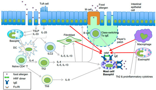 Model of HRF-mediated amplification of type 2 inflammation in food allergy. Epithelial damage or inflammation in the gut promotes increased entry of food allergens and secretion of the epithelial cytokines TSLP, IL-25, and IL-33 [44]. These cytokines initiate a Th2-skewed immune response. TSLP can enhance OX40L expression in dendritic cells, which induce Th2 cell differentiation of naïve CD4+ T cells [45]. IL-25 secreted by tuft cells may help the expansion of type 2 innate lymphoid cells (ILC2) [46]. Th2 cells along with ILC2 cells promote the Th2 cell-mediated immune response, which includes IgE class switch recombination in B cells, eosinophil accumulation, and mastocytosis. IL-9 promotes the expansion of IL-9-producing mucosal mast cells [47]. Basophils are also required for production of antigen-specific IgE as well as oral allergen-induced food allergy during sensitization [48,49] and allergen challenge phases [50]. IL-4 derived from basophils stimulated by cytokines such as IL-33 seems to be required for Th2 cell differentiation [51], and IL-4 promotes intestinal mast cell accumulation and activation [52]. HRF dimer/oligomers secreted from several types of cells amplify intestinal inflammation by enhancing antigen/IgE-mediated activation of mast cells and basophils [30]. This is likely due to increased HRF secretion by several types of cells in response to Th2, proinflammatory and epithelial cytokines. Modified from ref. 66 with permission from the journal Allergy.