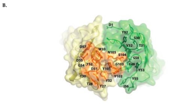 Isatuximab binds to a specific discontinuous epitope on CD38 that includes amino acids located opposite to the catalytic site of CD38 [13]. Mapping of the epitope and identification of the paratope were achieved by determining the crystal structure of soluble human CD38 in complex with the Fab fragment from isatuximab at 1.53 Å resolution (Figure 1A; Protein Data Bank identification code: 4 CMH). It is worth noting that isatuximab interacts with CD38 mostly via its heavy-chain paratope comprising 16 amino acids (Tyr27, Thr28, Thr30, Asp31, Tyr32, Trp33, Tyr52, Gly54, Asp55, Asp57, Asp100, Tyr101, Tyr102, Gly103, Ser104, Asn105), while isatuximab’s light-chain paratope includes 10 amino acids (Asp1, Ser30, Thr31, Val32, Tyr49, Ser50, Tyr53, Tyr55, Ile56, Tyr92) (Figure 1B). In this instance, the paratope is defined as antibody residues with atoms within 4.0 Å of the antigen atoms.