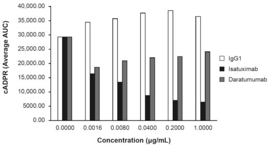 CD38 has both ADP ribosyl-cyclase activity and hydrolase enzymatic activity (conversion of nicotinamide adenine dinucleotide [NAD] to cADPR and ADPR in CD38-expressing cell lines) [15]. Daratumumab was shown to partially inhibit the cyclase activity of CD38 in vitro using recombinant CD38 protein or CD38-expressing cells [8].