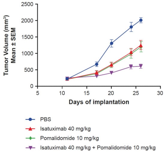 Pomalidomide enhances isatuximab activity in vivo. Female NSG mice (n = 8/group) with subcutaneously implanted MOLP-8 tumors (3 × 106 cells in 50% matrigel) were treated with PBS, isatuximab (5 doses of 40 mg/kg IV), pomalidomide (10 mg/kg intraperitoneally, once daily for 14 days), or the combination of both isatuximab and pomalidomide. IV, intravenously; NSG, NOD scid gamma; PBS, phosphate-buffered saline; SEM, standard error of mean.