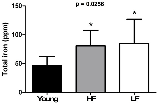 Total content of iron in the vastus lateralis muscle of young and old participants. Bars represent mean values (± standard deviation) in the three experimental groups. Values are expressed in ppm. * p < 0.05 vs. young group (n = 11). HF: high-functioning (n = 16); LF: low-functioning (n = 7).