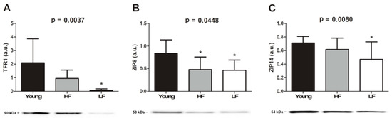 Protein expression of (A) transferrin receptor 1 (TFR1), (B) Zrt-Irt-like protein (ZIP) 8, and (C) ZIP14 in the vastus lateralis muscle of young and old participants. Bars represent mean values (±standard deviation) in the three experimental groups. Values are expressed in arbitrary units (a.u.). Representative blots are shown. * p < 0.05 vs. young group (n = 11). HF: high-functioning (n = 16); LF: low-functioning (n = 7).