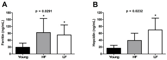 Plasma levels of (A) ferritin and (B) hepcidin in young and old participants. Bars represent mean values (± standard deviation) in the three experimental groups. * p < 0.05 vs. young group (n = 11). HF: high-functioning (n = 16); LF: low-functioning (n = 7).