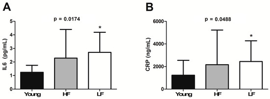 Plasma levels of (A) interleukin 6 (IL6) and (B) C-reactive protein (CRP) in young and old participants. Bars represent mean values (±standard deviation) in the three experimental groups. * p < 0.05 vs. young group (n = 11). HF: high-functioning (n = 16); LF: low-functioning (n = 7).