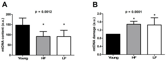 (A) mtDNA content and (B) mtDNA damage in the vastus lateralis muscle of young and old participants. Bars represent mean values (± standard deviation) in the three experimental groups. * p < 0.05 vs. young group (n = 11). HF: high-functioning (n = 16); LF: low-functioning (n = 7).