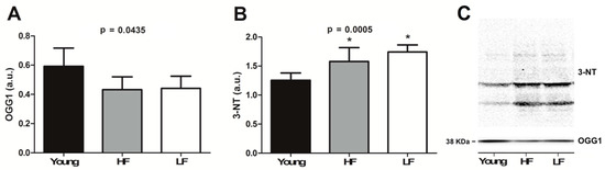 Protein expression of (A) 8-oxoguanine DNA glycosylase (OGG1) and (B) levels of 3-nitrotyrosine (3-NT) in the vastus lateralis muscle of young and old participants. Bars represent mean values (±standard deviation) in the three experimental groups. Representative blots of OGG1 and 3-NT are shown in panel (C) a.u. arbitrary units. * p < 0.05 vs. young group (n = 11). HF: high functioning (n = 16); LF: low functioning (n = 7).