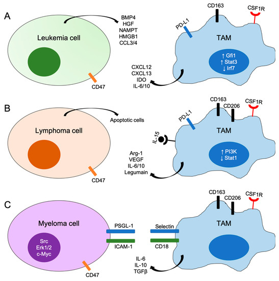 Increasing evidence also underlined the important role TAMs play in hematologic malignancies [4,5]. Within the TME of leukemia, lymphoma or myeloma, there are dynamic interactions between immune cells, including TAMs and the malignant hematologic cells. Under the influence of tumor cells, these TAMs are then reprogrammed into an immunosuppressive and pro-tumorigenic phenotype, which can in turn subvert immune responses and contribute to accelerated tumorigenesis. This review focuses on recent discoveries on the role of TAMs in hematologic malignancies.