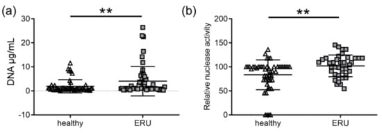 Free extracellular DNA and relative nuclease activity in serum. The amounts of free extracellular DNA (a) and relative nuclease activity (b) were analyzed in serum from 52 equine recurrent uveitis (ERU) patients and 51 eye-healthy control animals (study part I, Munich). In (a), a Pico Green assay was used. Significantly more free DNA was detected in the ERU serum compared with the control serum. In (b), the relative nuclease activity was calculated to a control digestion with DNase I. The individual values and the mean value of the respective groups are given. In the ERU serum, a significantly higher nuclease activity was observed compared with the control serum. In (a,b) the individual values and the mean value ± SD of the respective groups are shown (** p < 0.01, two-tailed Mann–Whitney test).
