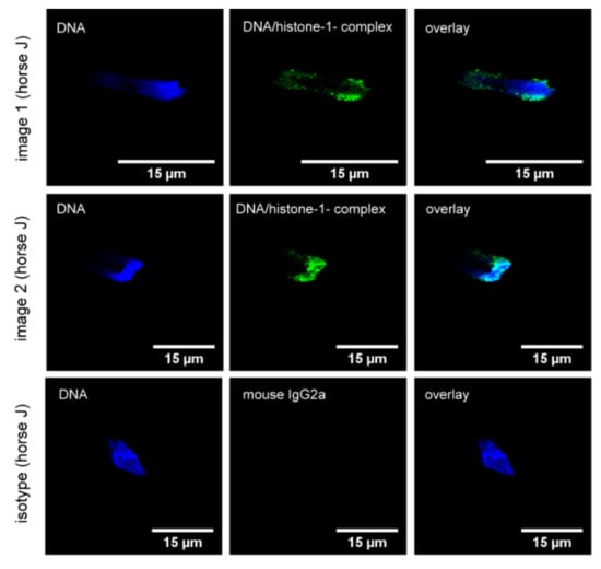 A Leica TCS SP5 AOBS confocal inverted-base fluorescence microscope with an HCX PL APO 40× 0.75–1.25 oil immersion objective and an HCX PL APO lambda blue × 63 1.40 oil immersion UV objective was used to record the samples in study part II. The settings were adjusted with respective isotype controls. For the NET induction assays, in each sample, a minimum of six randomly selected images per independent experiment were taken and used for quantifying the activated NET-positive cells. On the basis of the inhomogeneous structure and size of nuclei in horse neutrophils, the size of nuclei was not used as a parameter for the NET-positive cells. Instead, a cell was defined as positive when the nucleus of the cell showed a positive signal for DNA/histone-1 staining as NET marker. For each individual experiment and horse, a respective negative control was analyzed in parallel.