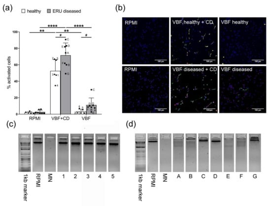 As host nucleases are important for NET elimination and might also be present in the VBF, we evaluated their corresponding activities in the VBF samples by means of a DNase activity test. The numbers and letters below the gels and in the graph indicate the corresponding samples tested at the same time for NET formation. While the VBF of horses with healthy eyes were all negative, most of the VBF of ERU-diseased horses showed distinct nuclease activity (Figure 5c,d). These data are in good accordance with the detected increased nuclease values in sera from ERU-diseased horses shown in Figure 1. Although this difference between the amount of activated cells in VBF compared with VBF without nuclease activity was not significant, a tendency for higher nuclease activity in VBF of ERU-diseased horses was detectable (p = 0.068). However, it is important to highlight that a high amount of NET formation was found in neutrophils treated with VBF of ERU-diseased horses, despite the presence of the shown higher nuclease activity. These data again confirmed that NETs might play a role during ERU pathogenesis.