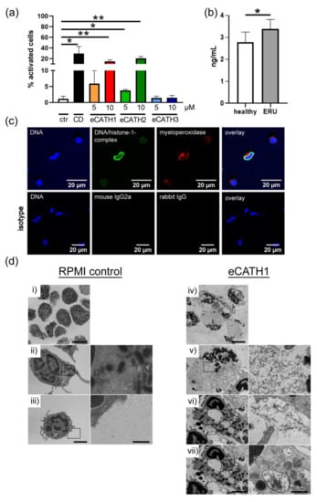 Influence of equine cathelicidins (eCATH) 1-3. (a) After a 240 min incubation period, eCATH 1 and 2 activated neutrophils in RPMI depending on the quantity used, whereas eCATH 3 did not lead to activation. The bars represent mean ± SD of three independent experiments. A one-tailed paired t-test was conducted. p values of * p < 0.05 and ** p < 0.01 compared with control were considered significant. (b) Equine cathelicidins in VBF. The amounts of equine cathelicidins in VBF of ERU-diseased (n = 7) and controls with healthy eyes (n = 5) were analyzed using a commercial ELISA. A significant increase in equine cathelicidins in VBF of ERU-diseased horses was observed. The bars represent mean ± SD. A one-tailed unpaired t-test was performed. p values of * p < 0.05 compared with control were considered significant. In (c), representative immunofluorescence images of equine neutrophils stimulated with eCATH are presented, in this case with eCATH 2 and 10 µM in RPMI (blue = Hoechst, green = DNA/histone-1-complexes, red = myeloperoxidase). The respective isotype control stainings are included. In (d), transmission electron microscopy images of equine neutrophils are shown. Control images from neutrophils incubated for 120 min in RPMI are presented on the left-hand side. Neutrophils stimulated with eCATH 1 (10 µM in RPMI) for 120 min are presented on the right-hand side. An overview is given in (i) and (iv). The right column in each group displays respective magnifications with immunogold labeling (5 nm gold/H3-cit, 10 nm gold/elastase). (ii) shows an intact neutrophil with elastase positive granular. (iii) shows the intact outer membrane of an unstimulated neutrophil. (v) presents a neutrophil with a high amount of H3-cit and elastase positive content in the cytosol. (vi) shows the release of an extracellular trap that is H3-cit and elastase positive. (vii) depicts a neutrophil with H3-cit and elastase positive nuclear vesicles. Scale bar size: (i) and (iv) = 5 µm, (all others) left-hand side = 2 µm, (all others) right-hand side = 200 nm.