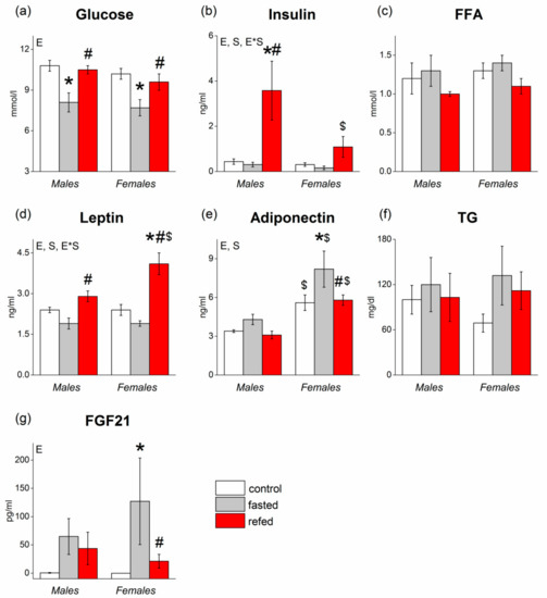 Concentrations of metabolites, including (a) glucose, (c) free fatty acid (FFA), (f) triglyceride (TG), and hormones, including (b) insulin, (d) leptin, (e) adiponectin, (g) FGF21, in the plasma of C57Bl/6J mice of three groups: control (fed ad libitum; white color), fasted for 24 h (grey color), and refed for 6 h after 24 h of fasting (red color). Two-way ANOVA was used with the factors of “sex” and “experimental group” (control, fasting, refeeding) with multiple comparisons using post hoc Fisher’s LSD test. Significance was determined as p < 0.05. S, sex effect; E, experimental group effect; and E*S, interactive effect of sex and experimental group. * p < 0.05 versus control group, # p < 0.05 versus fasting group, $ p < 0.05 versus males in the same group.