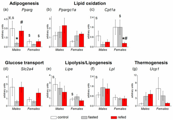 Expression of white subcutaneous adipose tissue (SAT) genes involved in glucose and lipid metabolism in C57Bl/6J mice of three groups: control (fed ad libitum; white color), fasted for 24 h (grey color), and refed for 6 h after 24 h of fasting (red color). (a) Pparg, (b) Ppargc1a, (c) Cpt1b, (d) Slc2a4, (e) Lipe, (f) Lpl, (g) Ucp1. Two-way ANOVA was used with the factors of “sex” and “experimental group” (control, fasting, refeeding) with multiple comparisons using post hoc Fisher’s LSD test. Significance was determined as p < 0.05. S, sex effect; E, experimental group effect. * p < 0.05 versus control group, # p < 0.05 versus fasting group, $ p < 0.05 versus males in the same group.