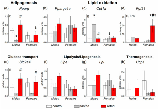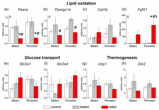 Expression of brown adipose tissue (BAT) genes involved in glucose and lipid metabolism in C57Bl/6J mice of three groups: control (fed ad libitum; white color), fasted for 24 h (grey color), and refed for 6 h after 24 h of fasting (red color). (a) Ppara, (b) Ppargc1a, (c) Cpt1b, (d) Fgf21, (e) Slc2a1, (f) Slc2a4, (g) Ucp1, (h) Dio2. Two-way ANOVA was used with the factors of “sex” and “experimental group” (control, fasting, refeeding) with multiple comparisons using post hoc Fisher’s LSD test. Significance was determined as p < 0.05. E, experimental group effect. * p < 0.05 versus control group, # p < 0.05 versus fasting group, $ p < 0.05 versus males in the same group.
